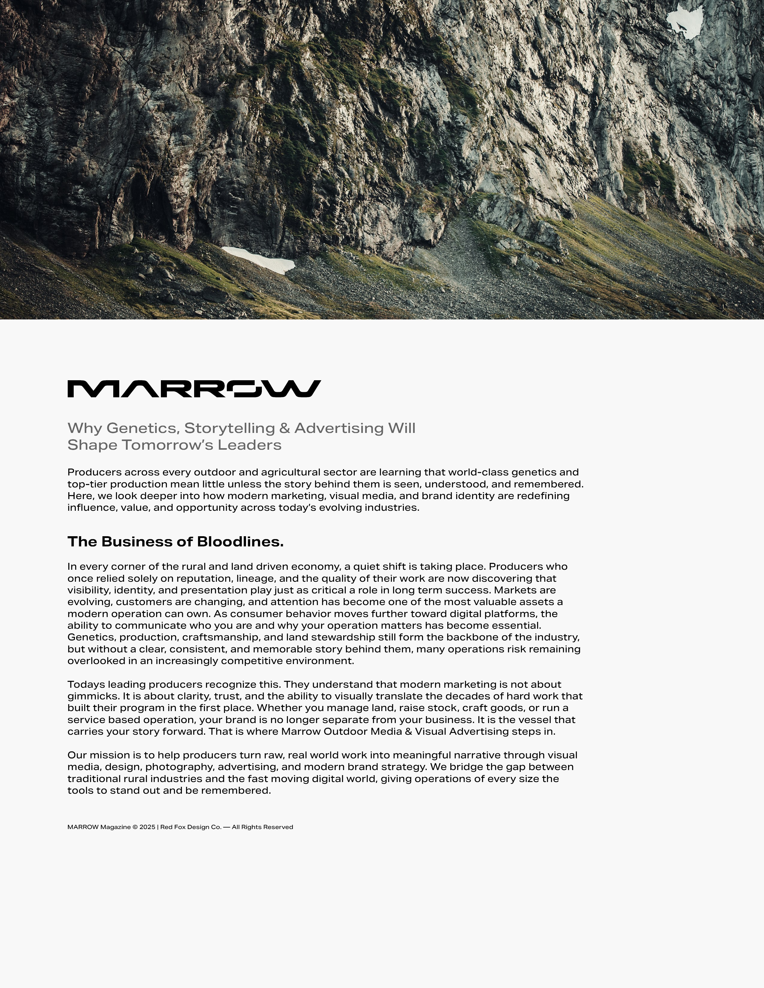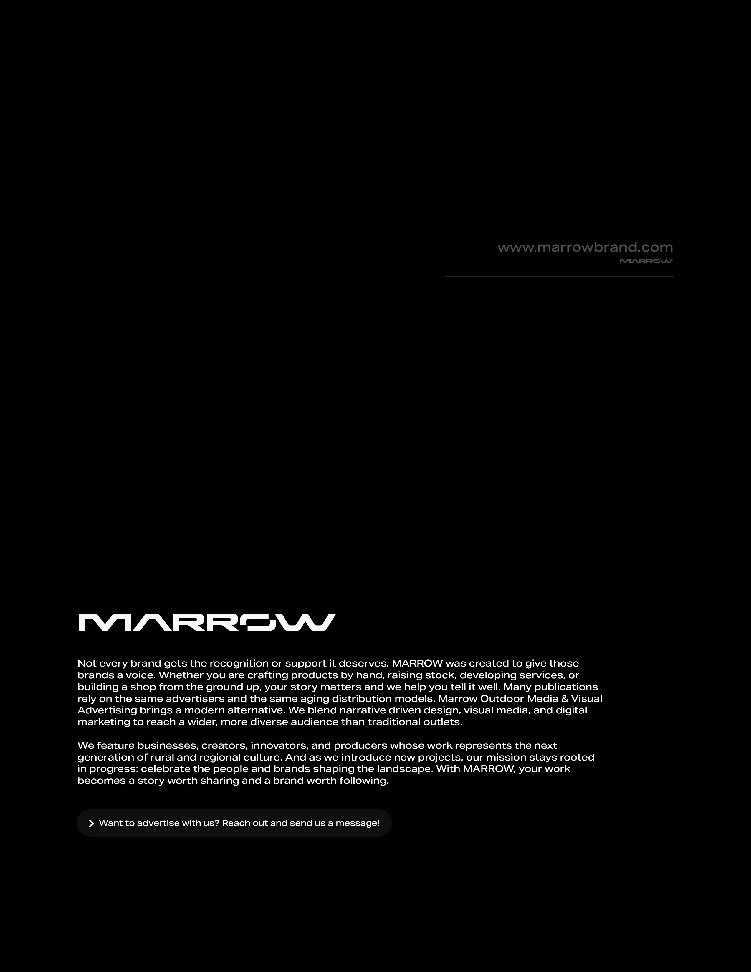 MARROW Magazine © 2025 | A Red Fox Design Co. Publication. All content appearing on this website and within MARROW Magazine, including articles, photography, artwork, and design elements, is protected under United States copyright law. No material may be reproduced, distributed, transmitted, or stored in any form without prior written permission from Red Fox Design Co., LLC or the original content creator. All trademarks and brand names referenced are the property of their respective owners and appear for editorial or advertising purposes only.